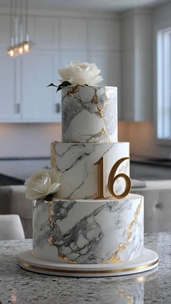 For the girl with contemporary taste who loves modern design, create a marble effect cake that’s sleek and sophisticated. Use fondant or buttercream techniques to create a realistic marble pattern in whites, grays, and blacks with veins running through like real marble. Add touches of gold – gold leaf accents, gold edges on the tiers, or gold geometric shapes. The number sixteen should be in modern gold lettering. Keep it minimal and let the marble pattern be the star. Maybe add one or two white roses or keep it completely clean and simple. It’s chic, it’s current, and perfect for someone who loves modern aesthetics and sophisticated design.