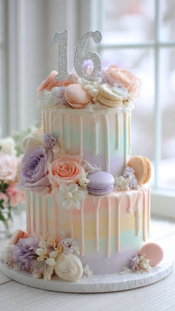 For the girl who loves color but wants something a bit more grown-up than bright primary rainbows, create a pastel rainbow drip cake. Start with white or very pale buttercream, then add drips in soft pastel rainbow colors – pale pink, peach, soft yellow, mint green, baby blue, and lavender. The drips should cascade down prettily. Top with pastel buttercream swirls, fresh flowers in coordinating pastels, maybe some macarons or meringues in pastel colors. Add a sparkly “16” on top. It’s fun and colorful but still sophisticated with those soft, pretty colors. Perfect for someone who wants their cake to be happy and bright but elegant at the same time.