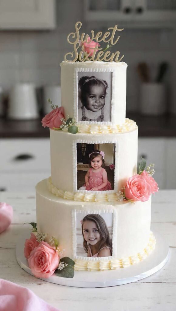 This cake is incredibly personal and touching – using edible image printing to showcase photos from her life on the cake tiers. Include baby pictures, childhood memories, family photos, friends, special moments from the past sixteen years. Arrange them artistically around each tier with buttercream borders and decorations between photos. Add her name and “Sweet Sixteen” in pretty lettering. Include some fresh flowers in her favorite colors. Maybe add special dates or meaningful quotes between photos. It’s guaranteed to make her emotional and creates this beautiful tribute to her journey to sixteen. Perfect for family-focused celebrations or when you want something really meaningful and personal.