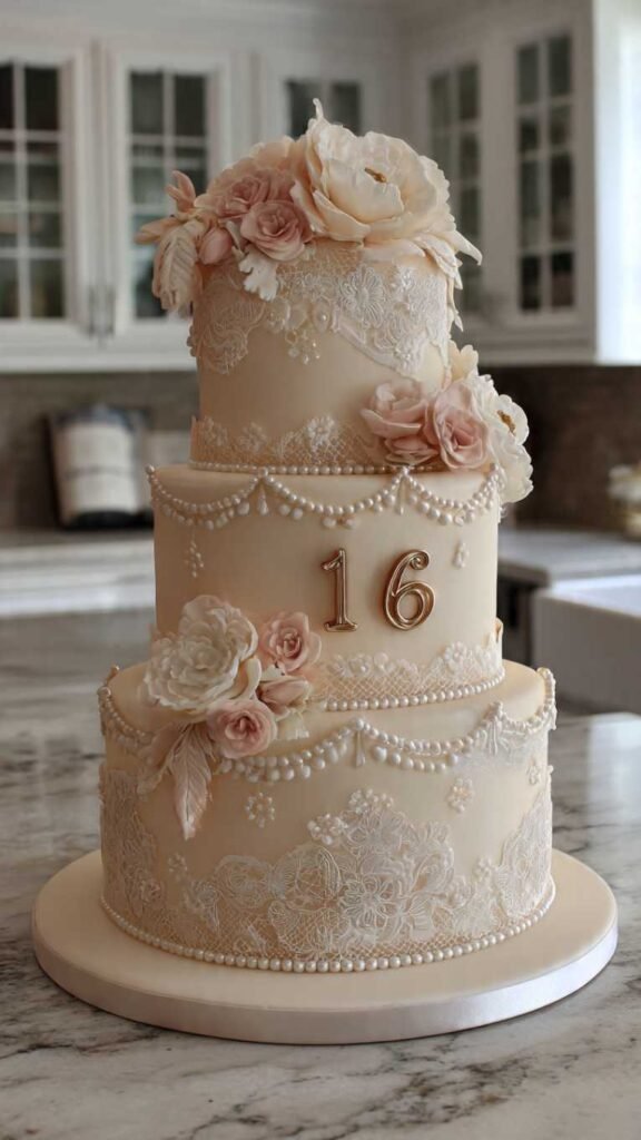 For a girl who loves vintage style, antiques, and romantic old-fashioned things, create a sweet sixteen cake with delicate lace piping and pearl details. Use royal icing to pipe intricate lace patterns all over the cake that look like vintage lace fabric. Add pearl borders, maybe some vintage-style sugar flowers in soft colors. The base can be ivory, champagne, or soft pink. Include a vintage-inspired “Sweet Sixteen” topper or the number sixteen in an ornate vintage font. You could add some real vintage jewelry pieces or brooches as non-edible decorations. It’s timeless and romantic, perfect for vintage-themed parties or someone who appreciates that old-world elegance.
